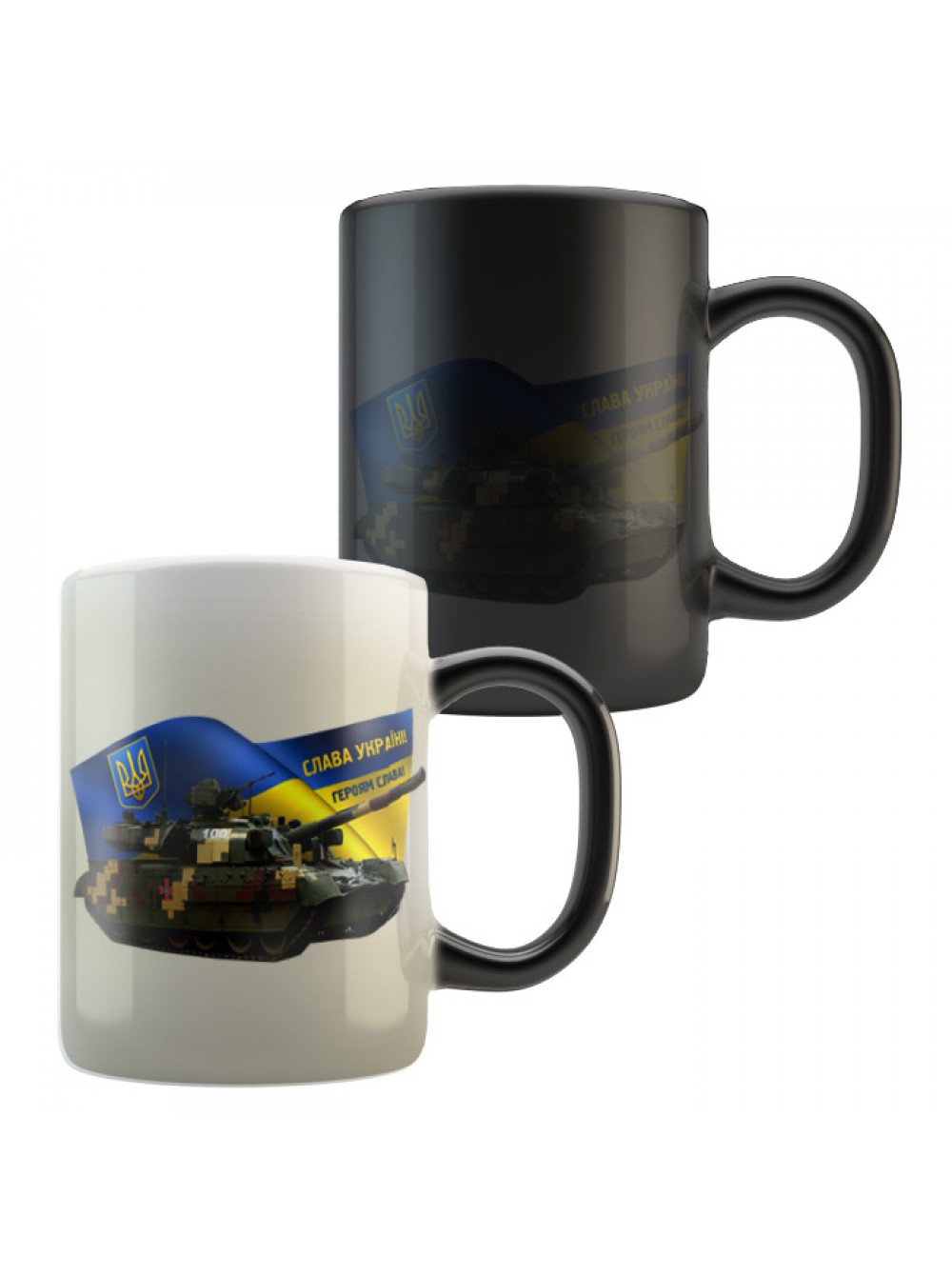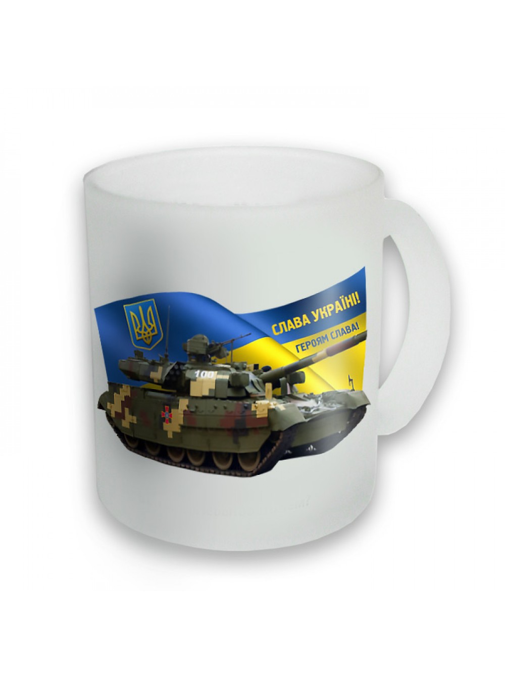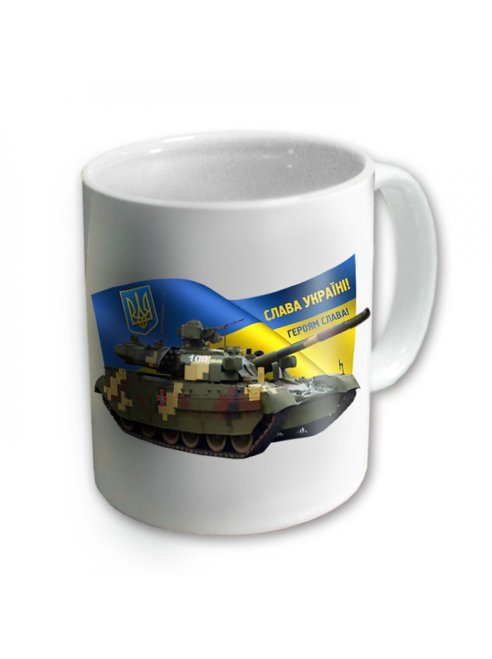 Чашка з танком Т64, забарвлення - український піксель. Дизайн розроблений у Бюро рекламних технологій. Т64 — основний бойовий танк на озброєнні української армії. Купити з військовим принтом можна циліндричну білу чашку або з кольоровою ручкою, скляну, хамелеон (при нагріванні біліє).