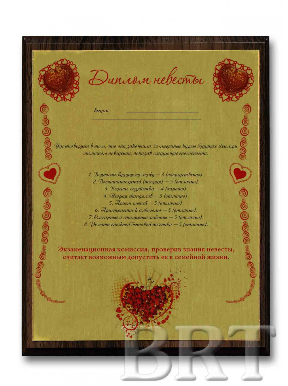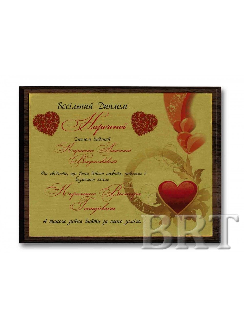 Іменний диплом нареченої в нашому дизайні яскравий і пишний. Якщо його повісити на стіні, буде не тільки приємним спогадом, але і прикрасою інтер'єру.