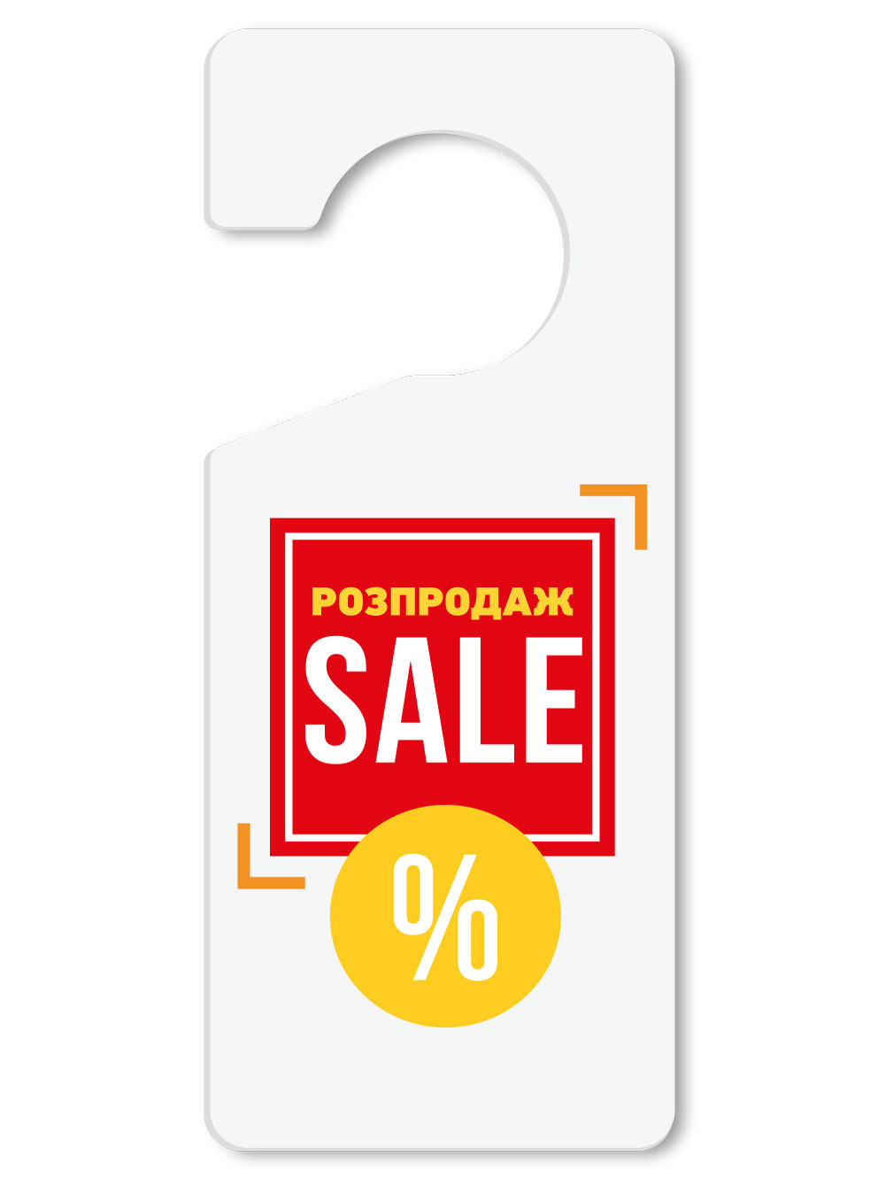 Табличка пластикова з написом "Sale Розпродаж %". Стильний, виразний дизайн спеціально створений, щоб привернути увагу покупців. Чудово підходить для позначення акцій, уцінок, розпродажу окремих колекцій або певного товару. Зроби свій SALE яскравим! Завдяки гачкоподібній формі бирку без зусиль можна кріпити та знімати. Пластик - матеріал не крихкий, стійкий до вологи та падінь. Ще більше моделей хенгерів від українського виробника на сайті "БРТ".