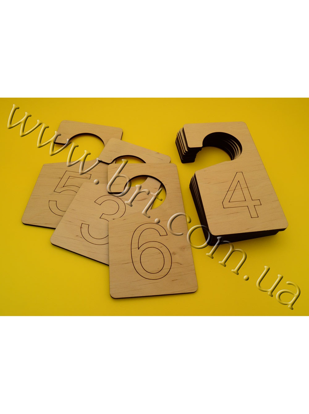 Хенгери (дорхенгери) із дерева зі своїм текстом, логотипом виготовляємо на замовлення у Києві. Одно- та двосторонні. Різної форми. Від однієї штуки. Бюро рекламних технологій: виробництво дерев'яних табличок, номерків, сувенірів.