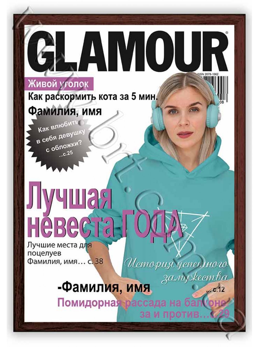 Ви можете вибрати інший журнал: "Наталі", "Cosmopolitan", "ЖЖ" (Жіночий журнал) або інший - залежно від уподобань вашої героїні. Надішліть текст на обкладинку - ми зробимо колаж, але ціна журналу не з нашої колекції буде вищою.