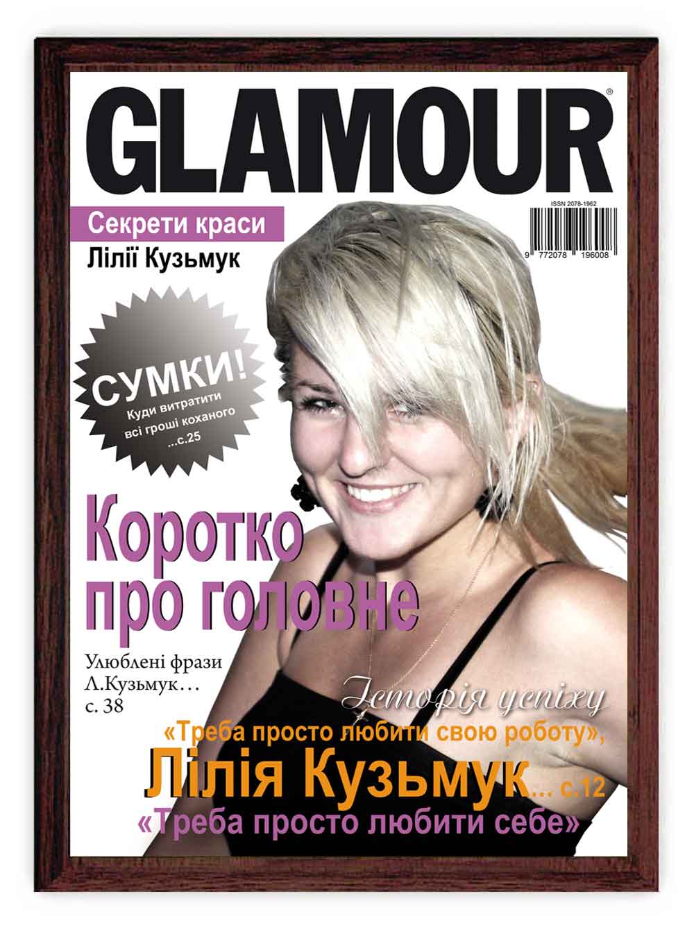 Глянцевий журнал для жінки зі своєю фотографією - гламурний, оригінальний подарунок. Робимо фотоколажі, друкуємо фотографії замовників на обкладинках жіночих журналів.