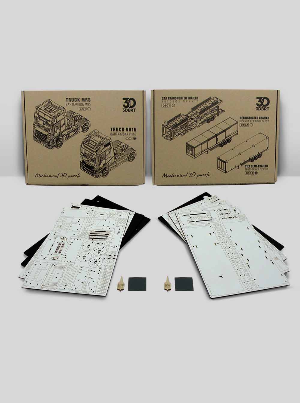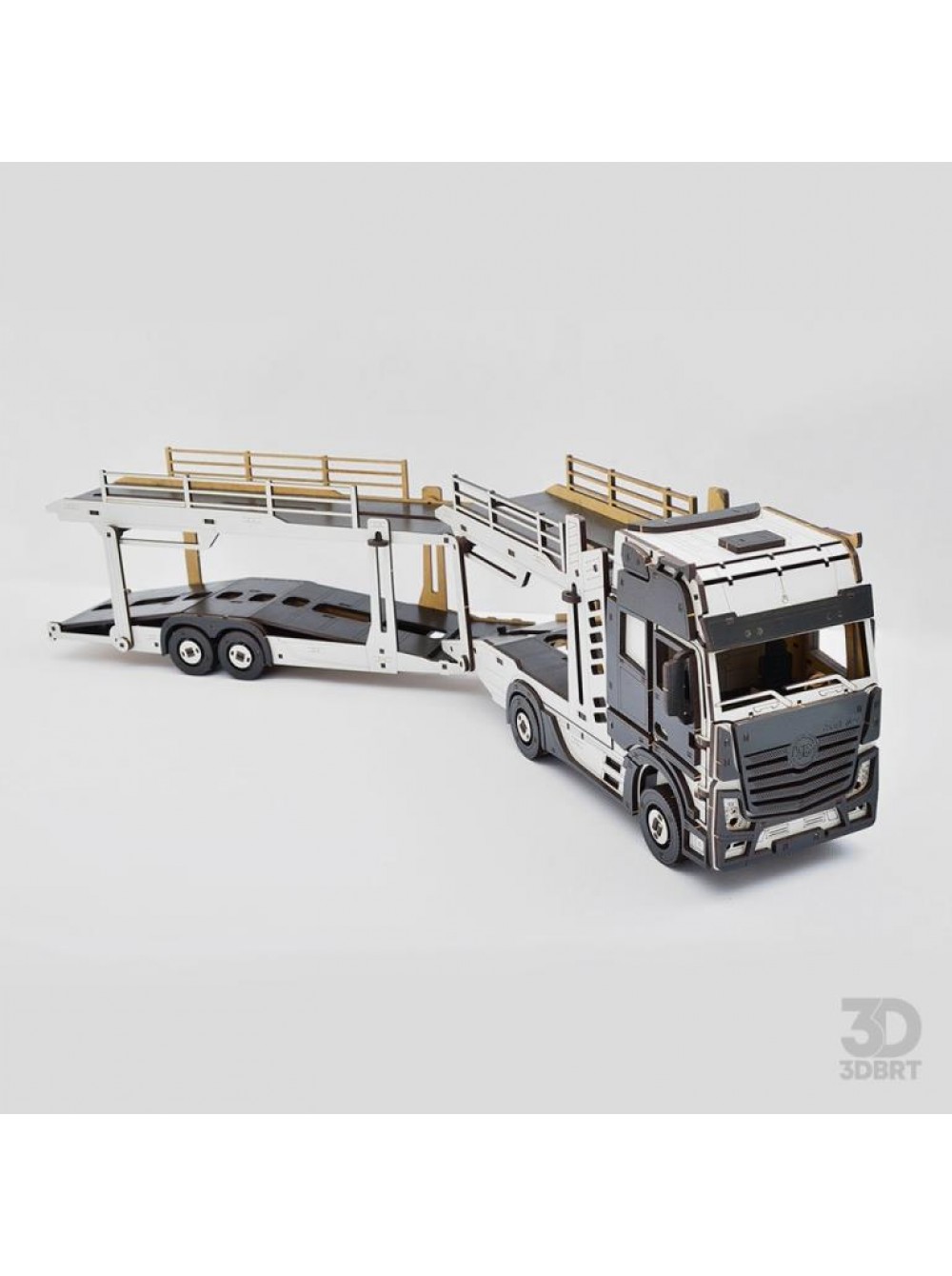 Автовоз (автомобилевоз) - сборный конструктор седельного тягача с полуприцепом, предназначенным для транспортировки легковых автомобилей. Сложная модель, имеющая множество деталей, и потому отличающаяся высокой реалистичностью. Всё как у настоящего "мерседеса" - прицеп можно отсоединить от тягача, рампу платформы опустить для загрузки/разгрузки легковушек, двери в кабине тоже открываются. Этот набор - один из самых популярных в линейке 3D пазлов торговой марки 3D BRT, и доступен в разных вариантах цветового исполнения: