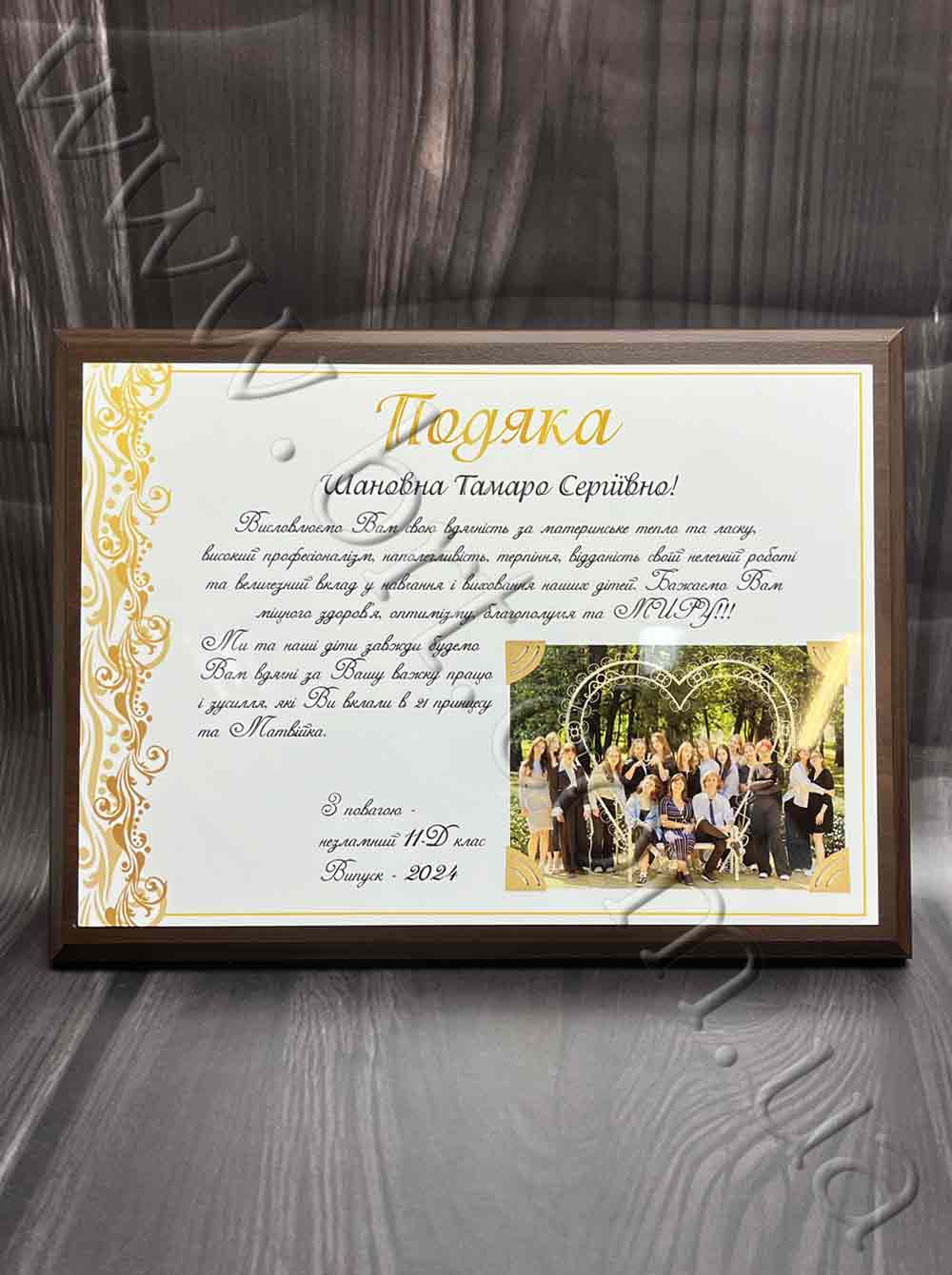 Благодарность учителю начальных классов, первому учителю, классному руководителю от родителей с фотографиями учеников делаем на заказ в Украине. Практически каждый год родители мучительно задумываются над подарками учителям. Банальные сервизы, наборы полотенец, сладкие презенты приятны, но не создадут такого впечатления, как памятная плакетка. «Бюро рекламных технологий» предлагает весьма оригинальный выход из ситуации – благодарственный диплом с фото детей.