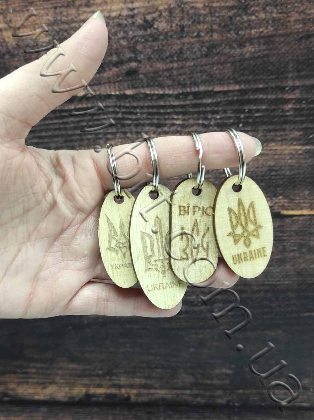 Деревянные брелоки для ключей с тризубами и надписями "Ukraine", "Украина", "Верю ВСУ". Патриотический набор из 4-х брелков прийдется по вкусу всей семье. Аксессуары легкие и удобные, прочные. Изображения устойчивы, т.к. выгравированы лазером. Дизайн, изготовление: "Бюро рекламных технологий".