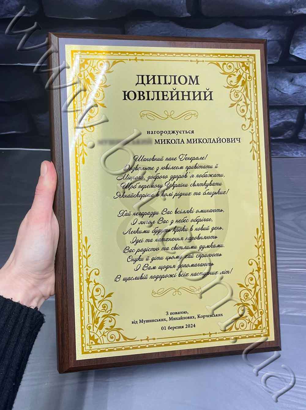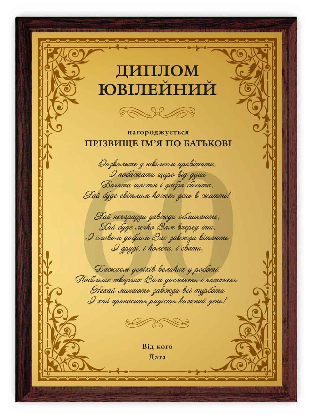 Диплом на юбилей 50, 60, 70, 80 лет мужчине, женщине со своим именем, датой, количеством лет. Дизайн торжественной награды создан в Бюро рекламных технологий. Диплом изготавливается из золотистого металла и темного дерева. Два размера на выбор. Поздравление в стихах или прозе.