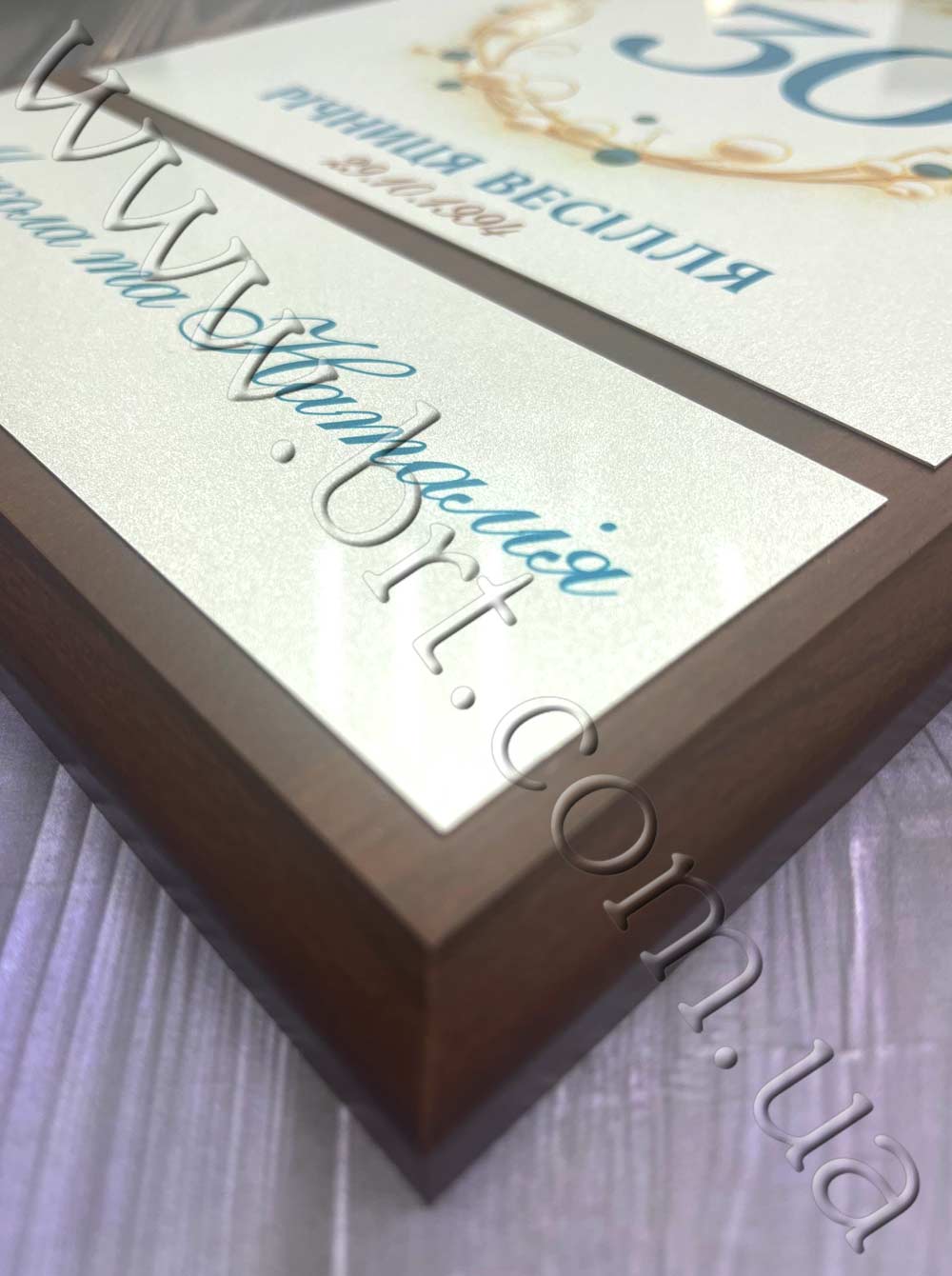 Диплом на жемчужную свадьбу с именами жены и мужа. Праздничная награда на юбилей «30 лет вместе» изготовлена из перламутрового металла и дерева. Памятный, необычный, великолепный подарок. Дизайн создан в Бюро рекламных технологий.
