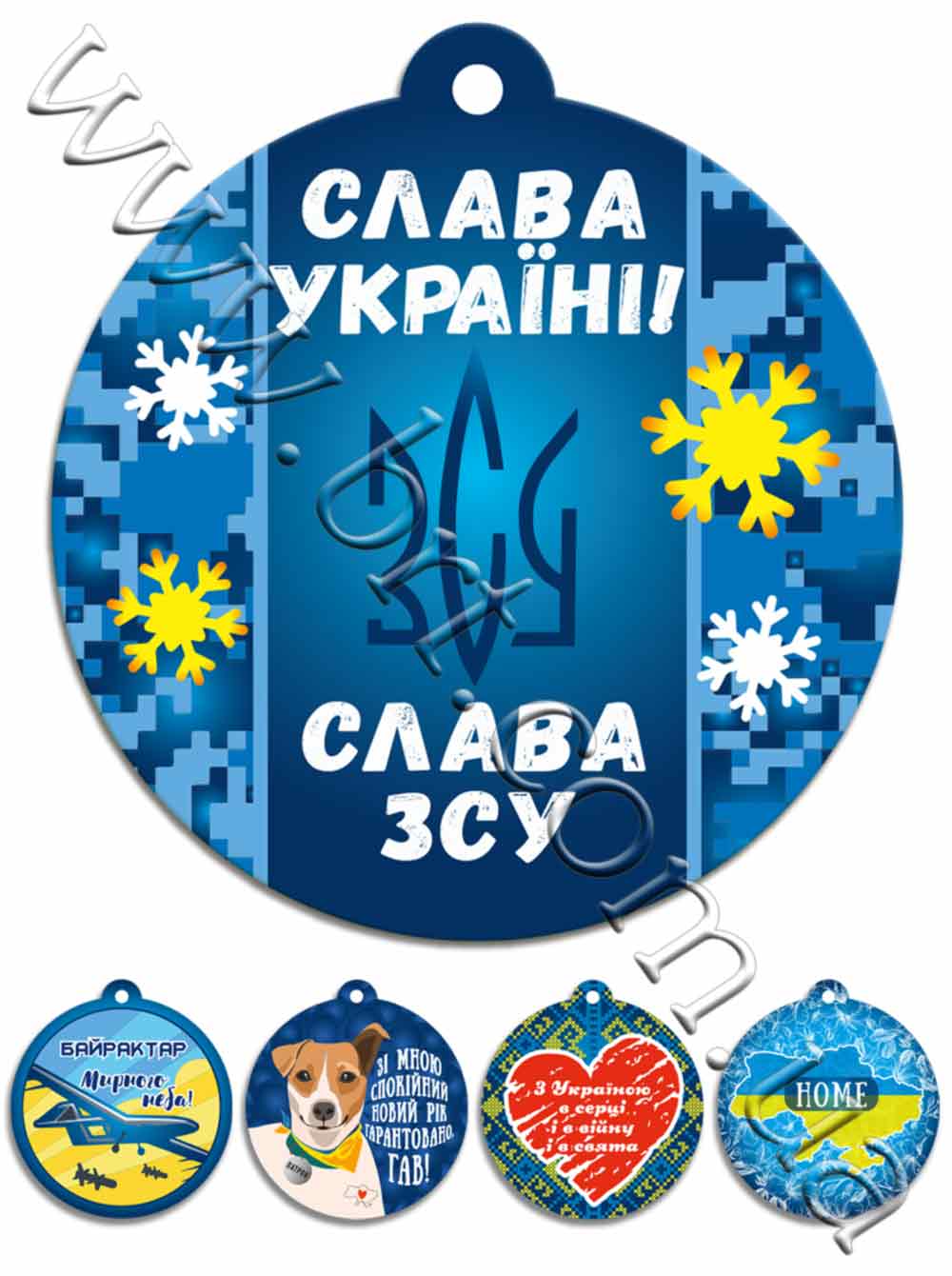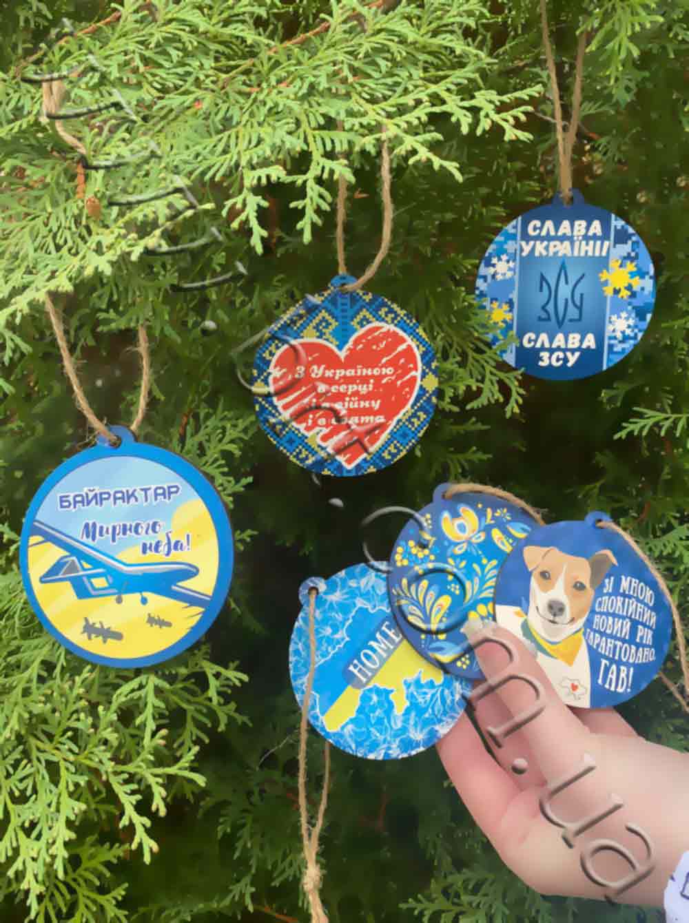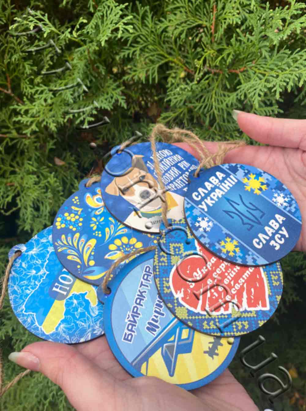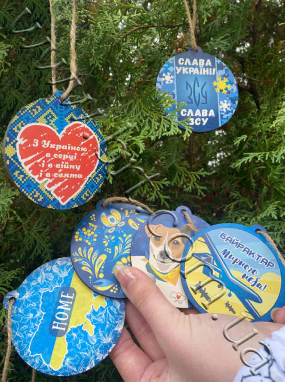 - На игрушках изображены патриотические украинские символы: пес Патрон, Байрактар, Украина в цветах с надписью "Home", петриковская роспись, вышиванка и т.д.