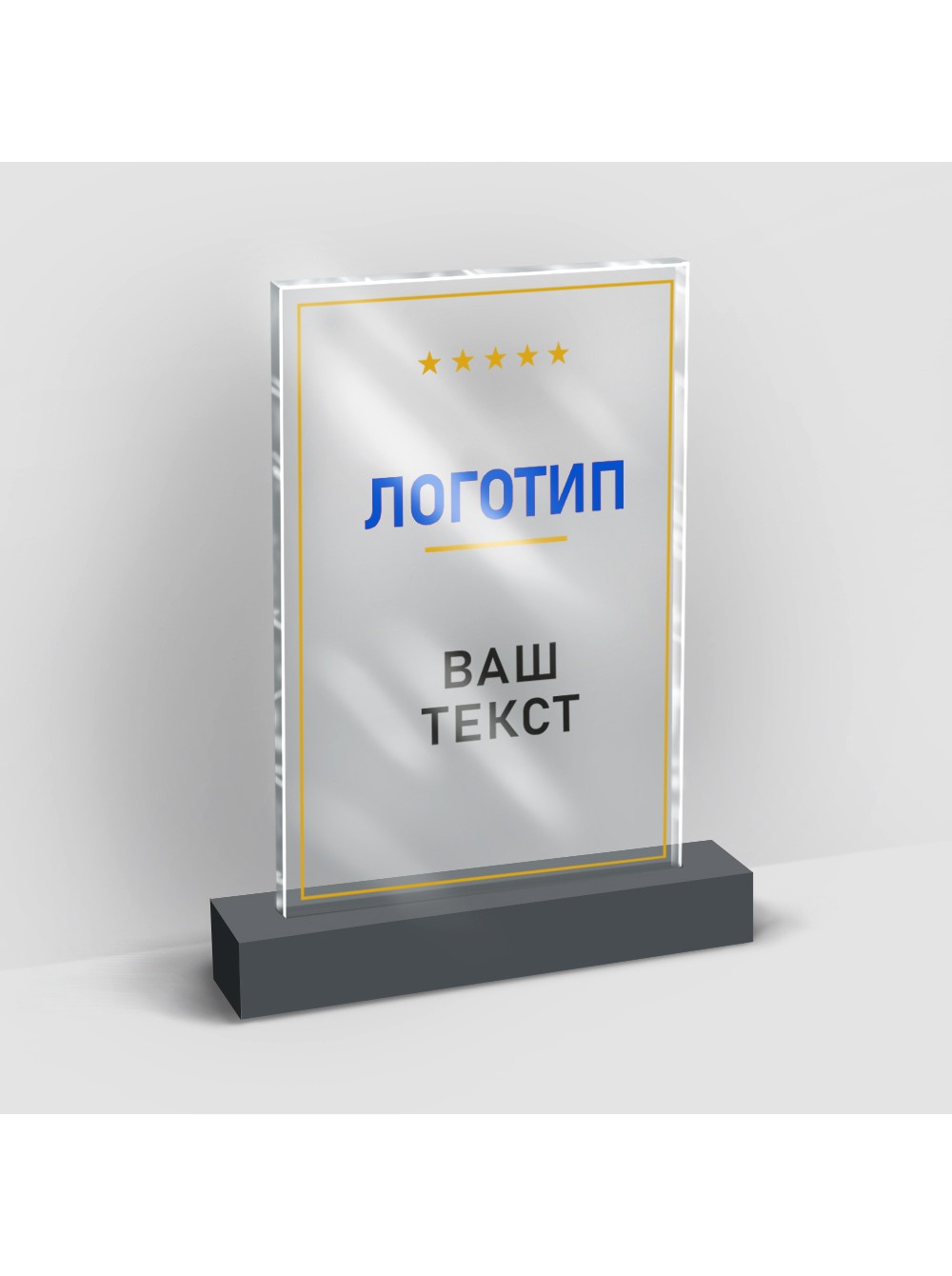 Заказать прозрачный приз из акрила на деревянной подставке со своим дизайном удобно на сайте производителя «Бюро рекламных технологий».
