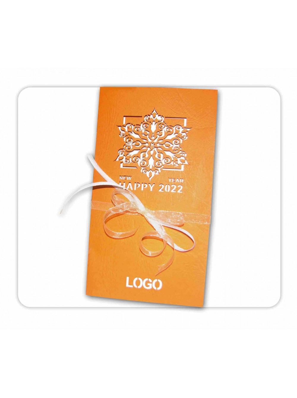 - Логотип, год, пожелание, праздничные узоры высечены на поздравительной открытке.