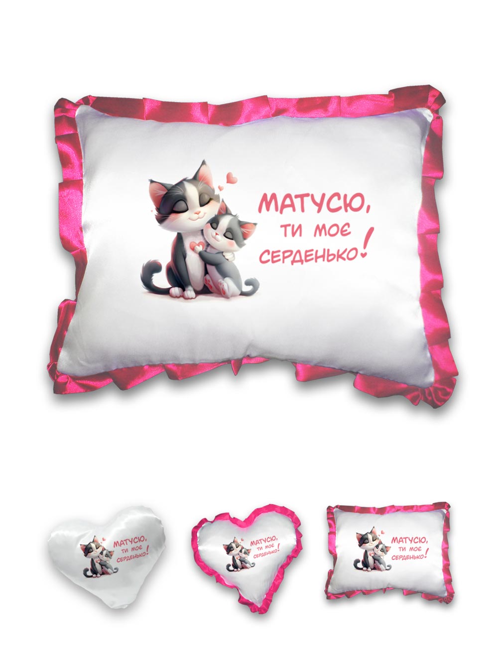 - На подушке - авторская иллюстрация от Бюро рекламных технологий: милая кошечка с котенком, розовыми лапками и ушками, среди сердечек.