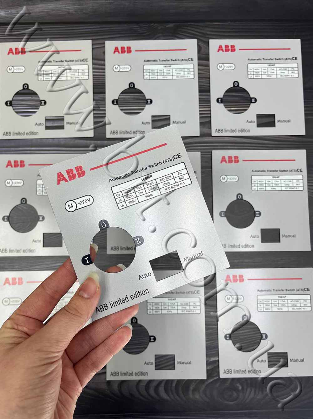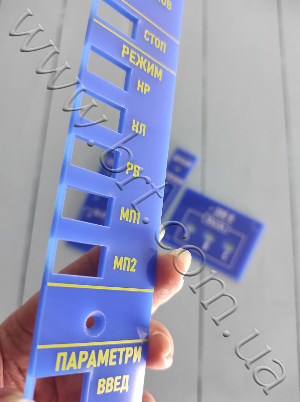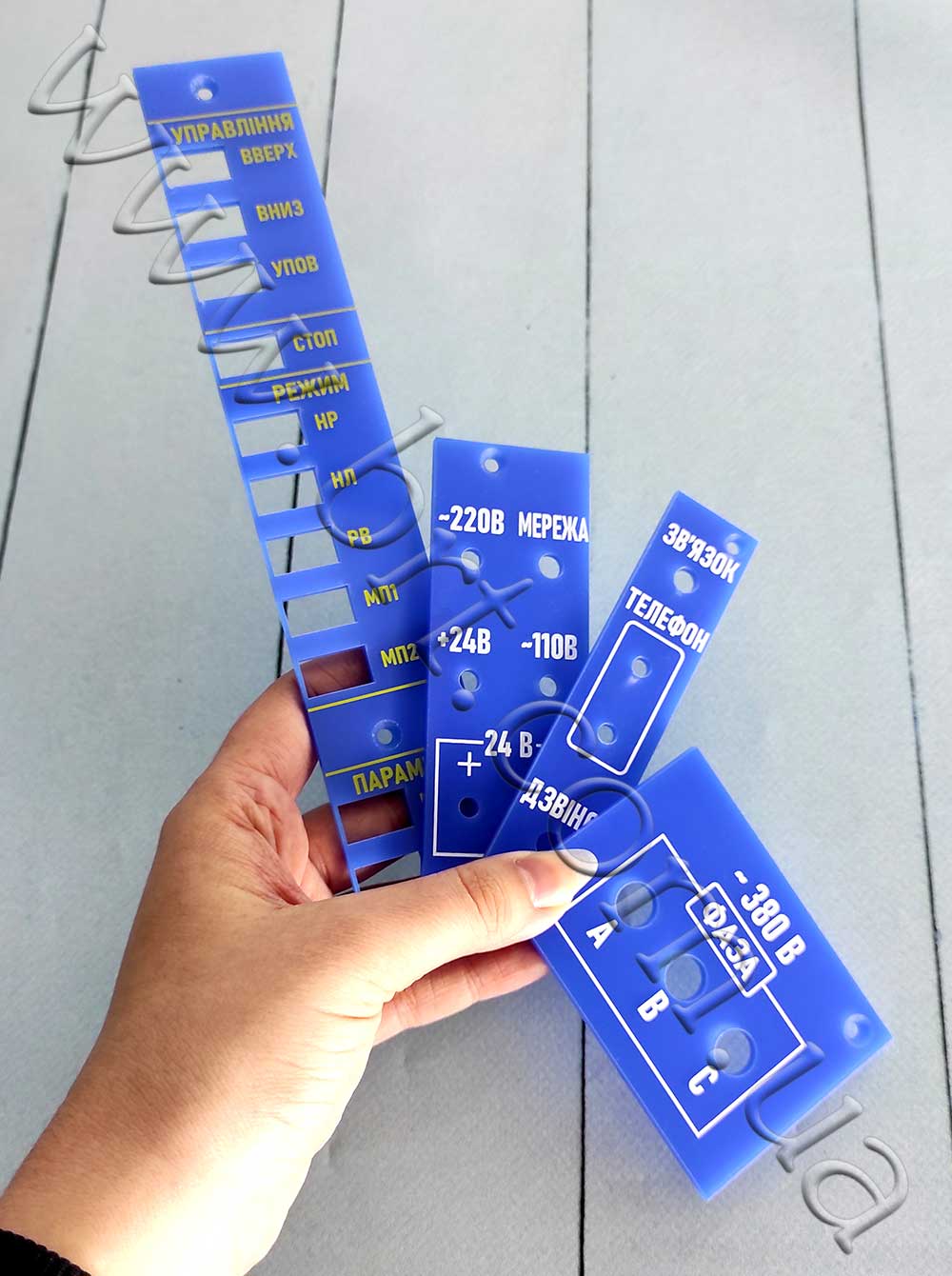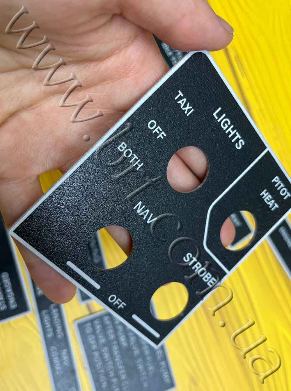 Приборные панели, мнемосхемы изготавливаем методом лазерной гравировки и УФ-печати, чтобы текстовая информация не стерлась со временем. Каждая панель индивидуальна, поэтому и диаметр, и размещение отверстий, и форма будут сделаны по эскизу заказчика.
