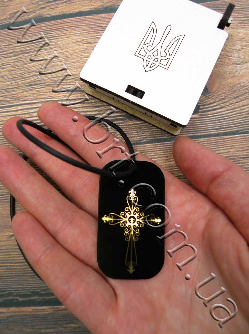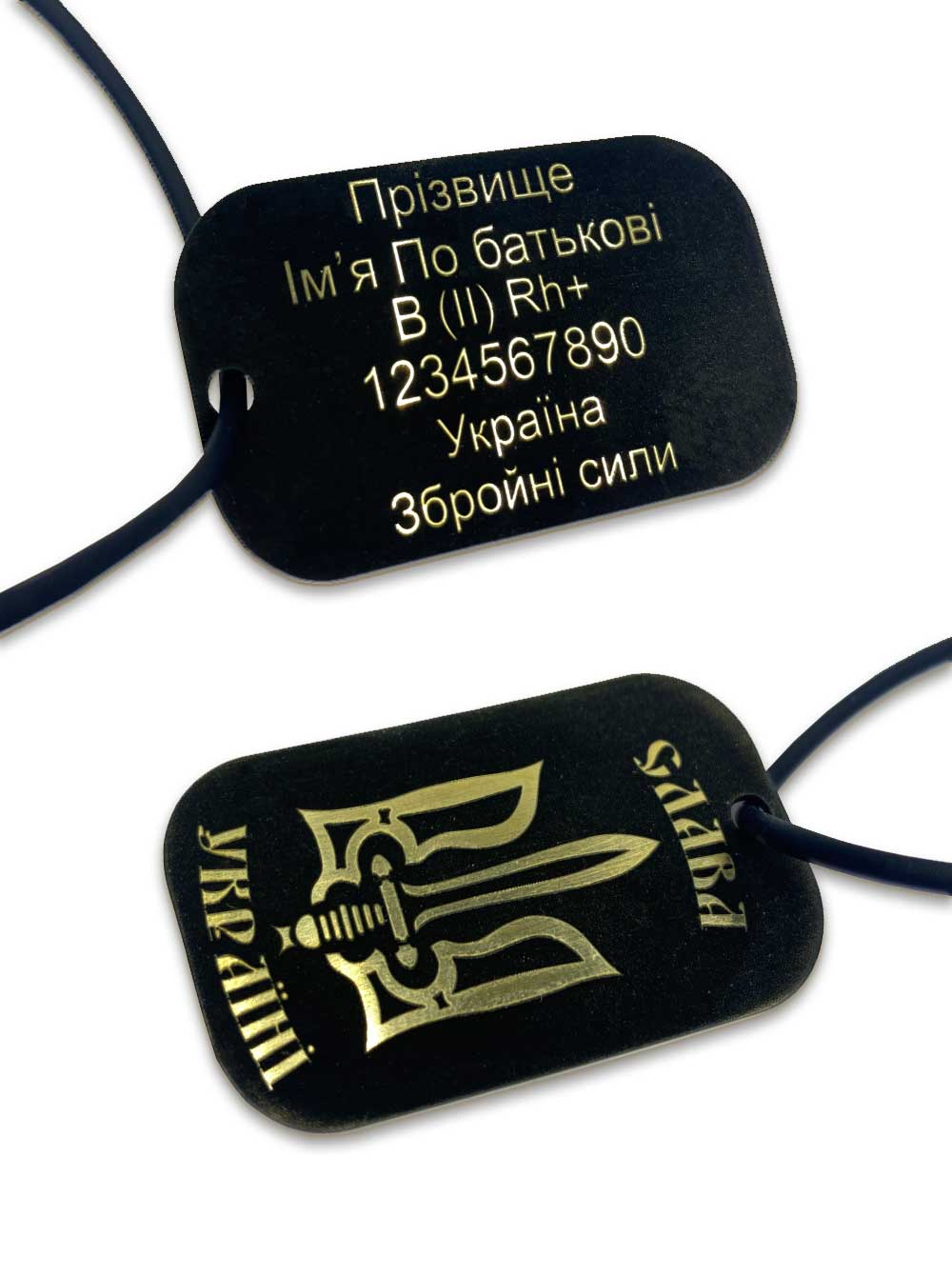 Черный военный жетон из латуни с лазерной гравировкой на заказ от "Бюро рекламных технологий".