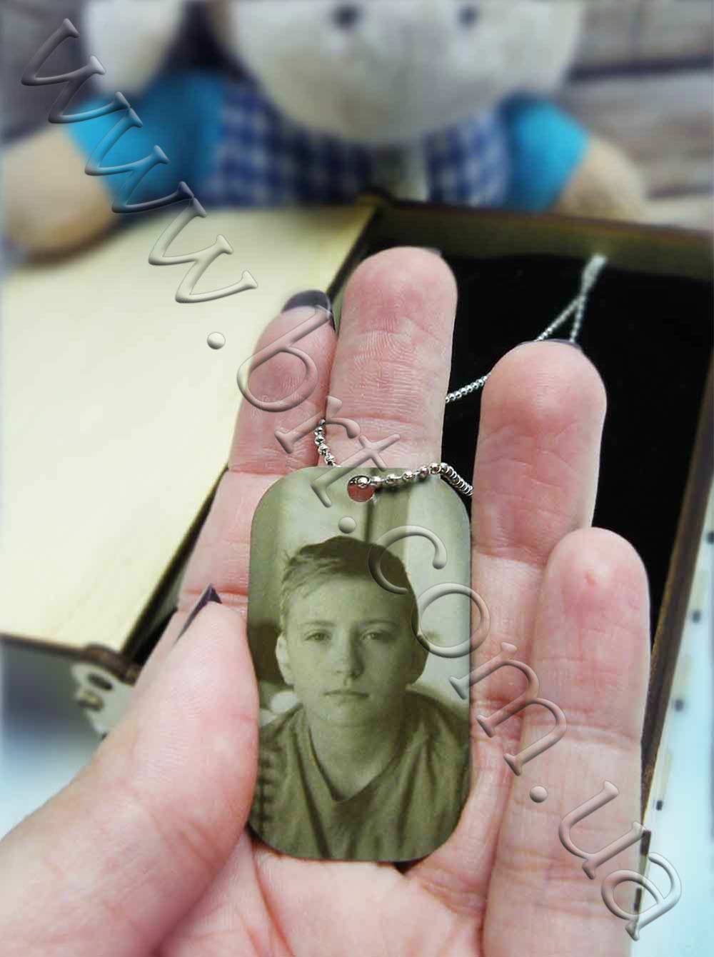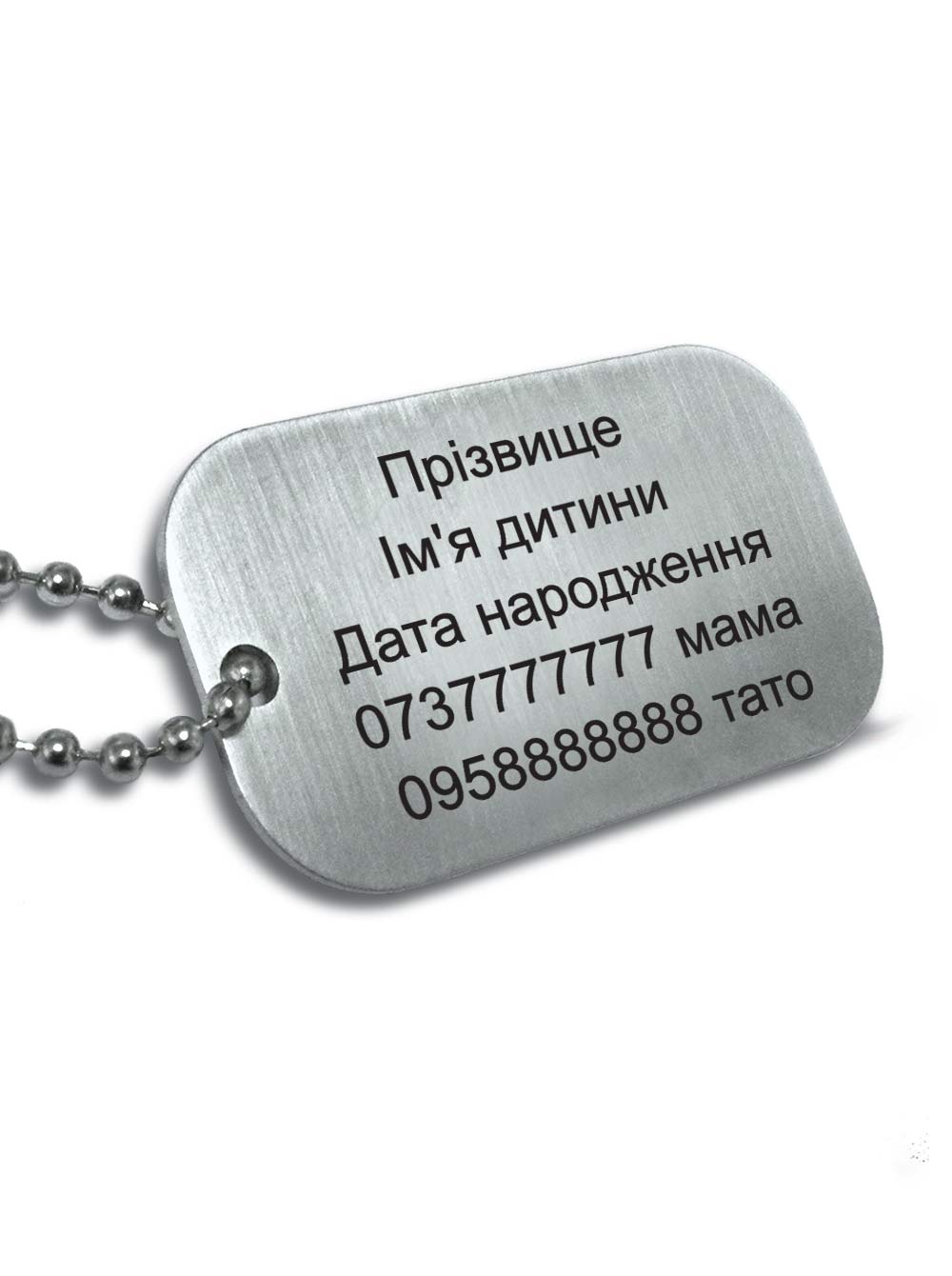 Жетон ребенку заказать с гравировкой телефона, адреса, фото у производителя "Бюро рекламных технологий".
