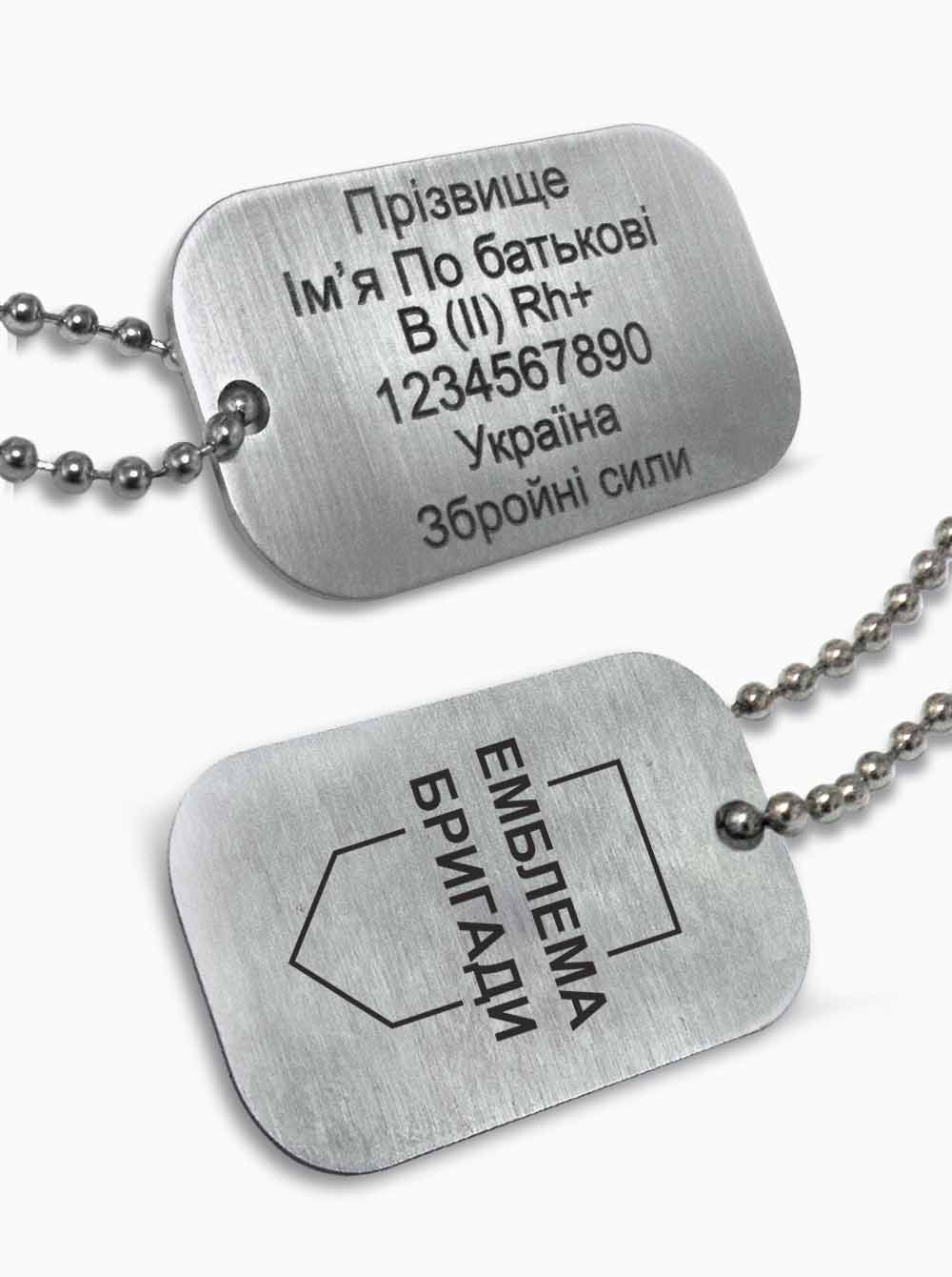 Стальной жетон с лазерной гравировкой эмблемы военного подразделения (Сухопутные войска, Воздушные силы, Военно-морские силы, Силы специальных операций, Десантно-штурмовые войска и т.п.) и своим именем заказать в Бюро рекламных технологий.