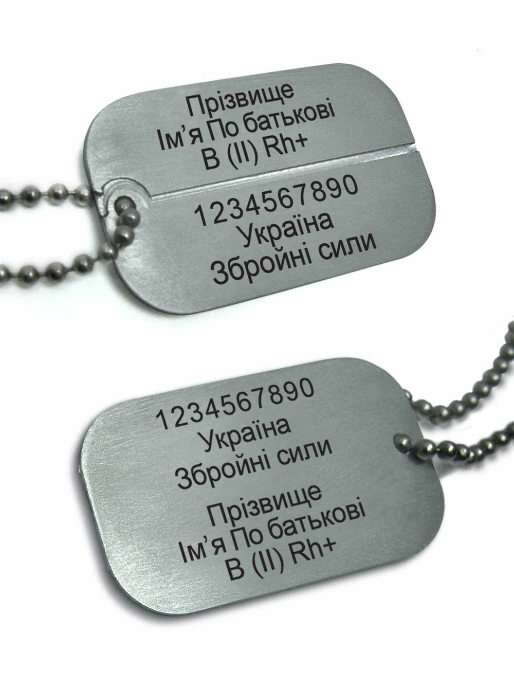 Жетон двухсторонний с лазерной гравировкой и перфорацией для разламывания на две части. С обеих сторон медальона дублируется личная информация военнослужащего. Изготавливаем идентификационные жетоны на заказ для украинских военных согласно инструкции по организации учета личного состава Вооруженных Сил Украины. Бюро рекламных технологий: свой склад металла и фрезеровочно-гравировальное оборудование для производства нагрудных знаков.