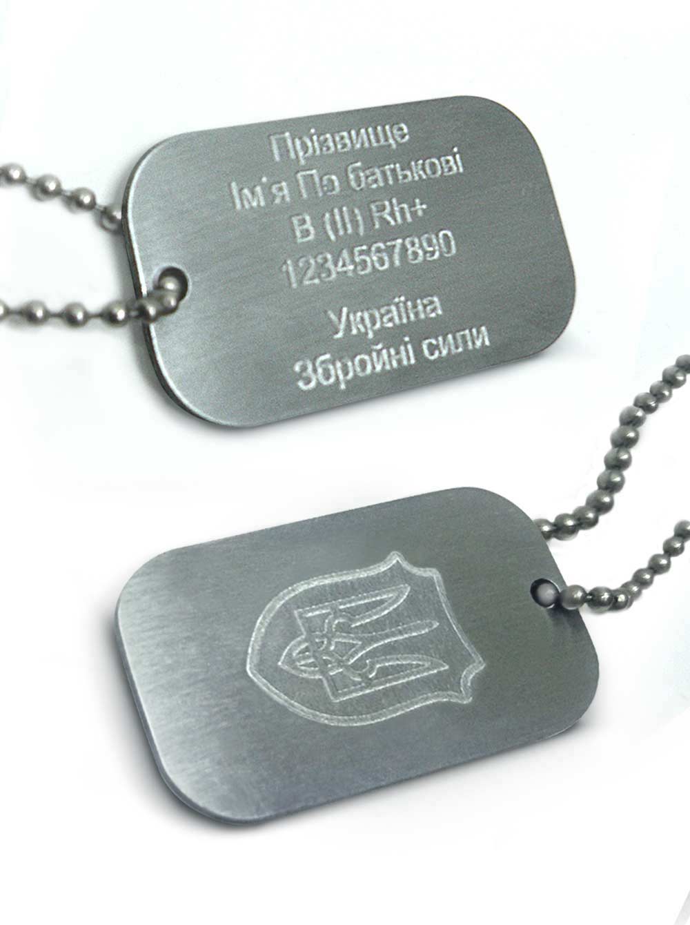Персональный жетон военнослужащего. Двухсторонний. С гравировкой личных данных военного и герба Украины. Купить у производителя "Бюро рекламных технологий" с комплектом фурнитуры: цепочкой или капроновым шнуром.