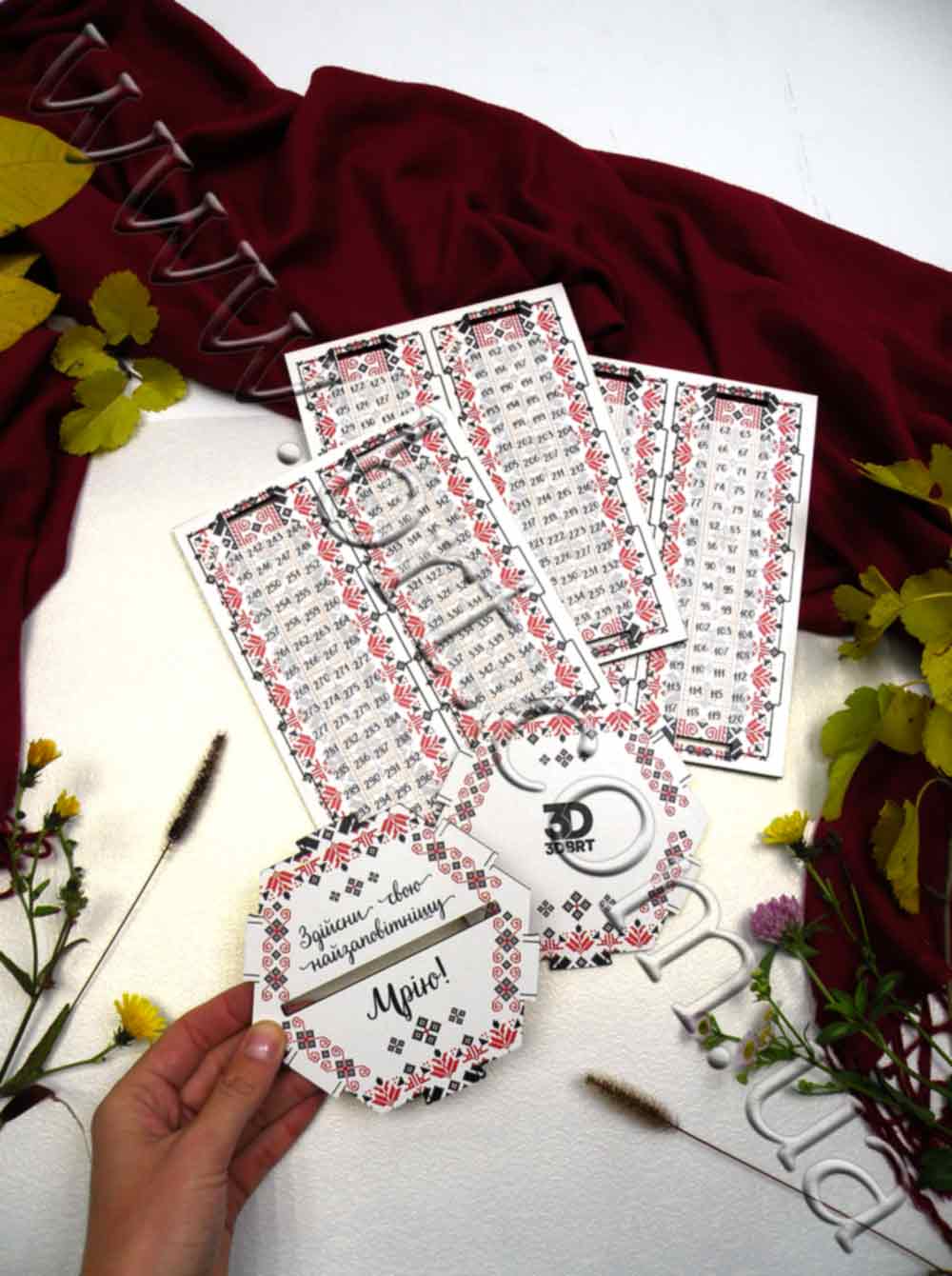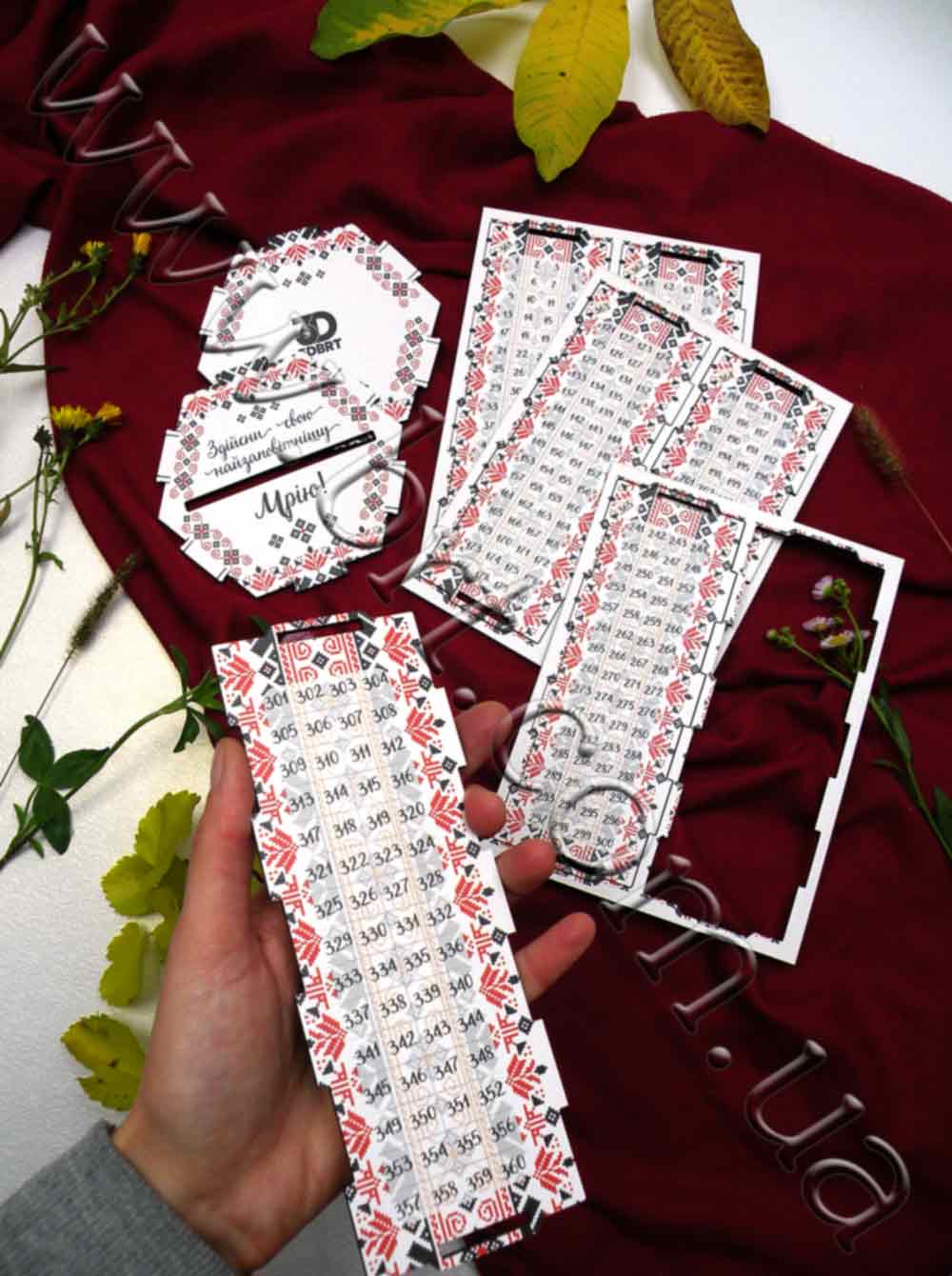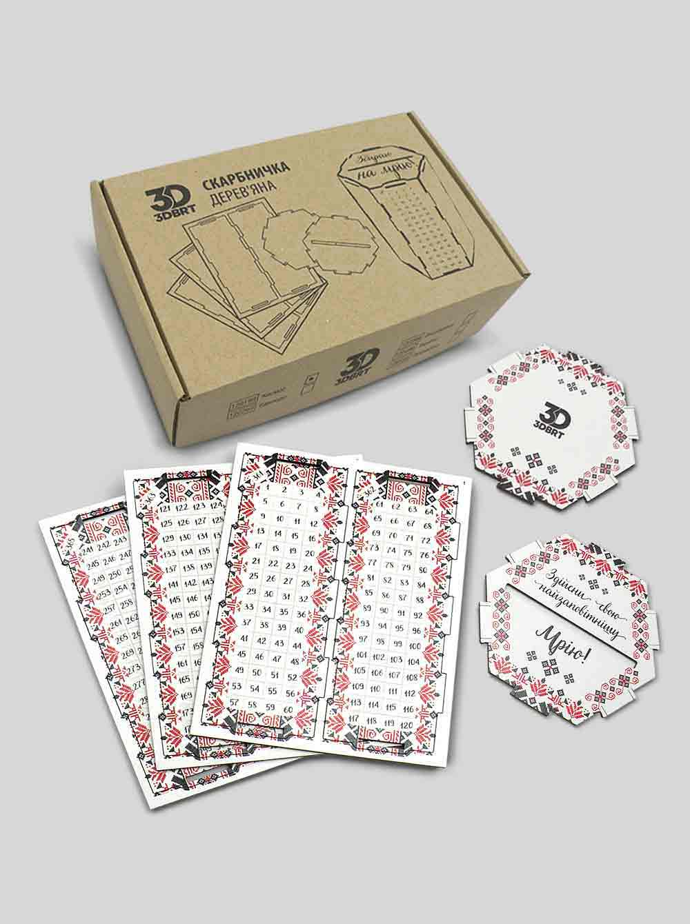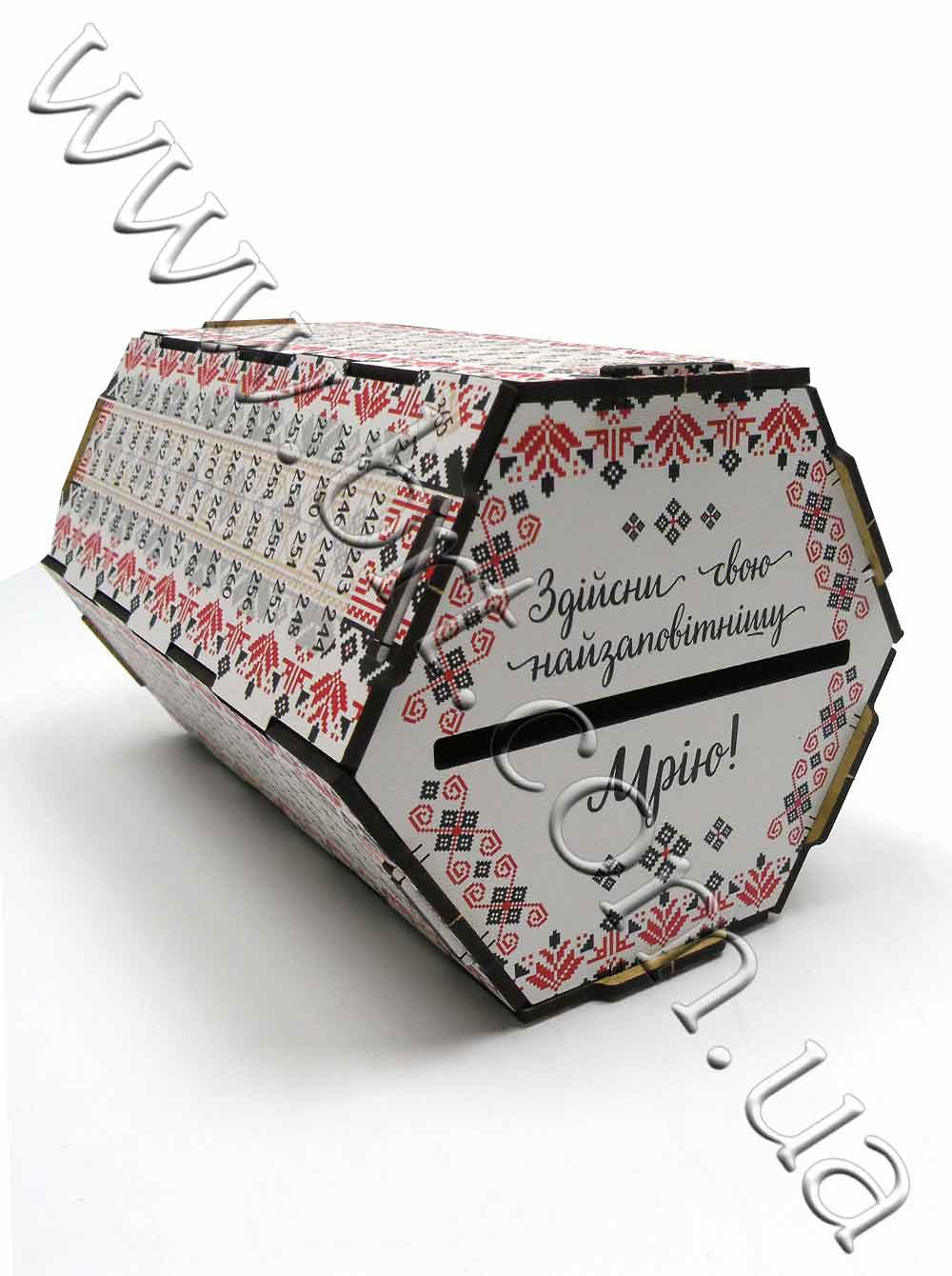 Дерев'яна скарбничка для грошей з українським орнаментом. Ошатна, патріотична розбірна скарбничка на 365 днів. Вишиванка надрукована екологічним УФ-чорнилом. Крафтова коробка. Дизайн авторський: Бюро рекламних технологій. Купити без передоплати у виробника. Роздивитися скарбничку з вишиванкою на відео БРТ.