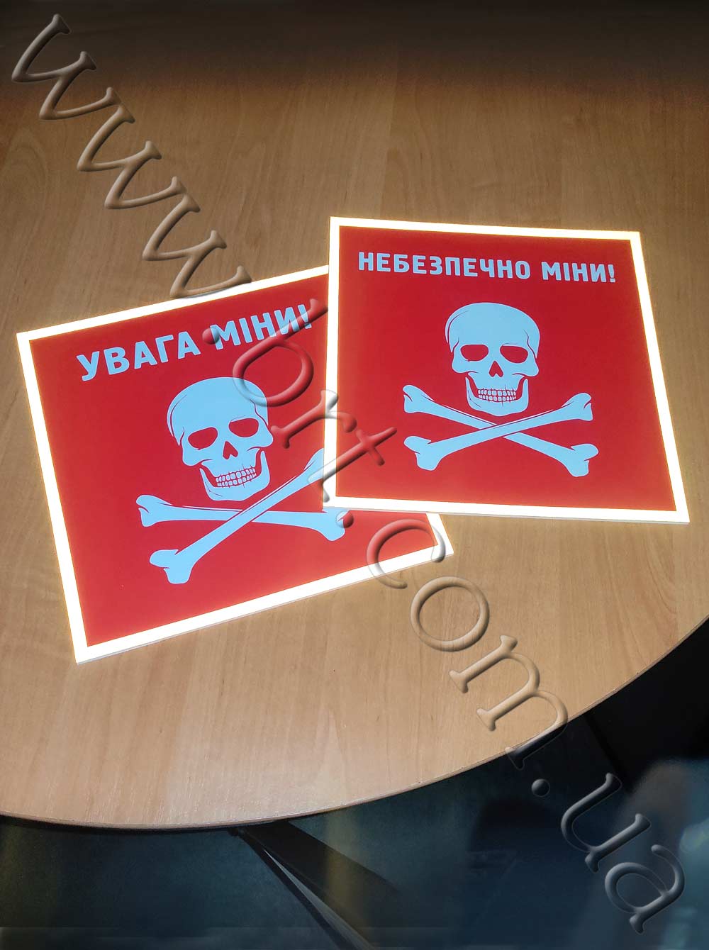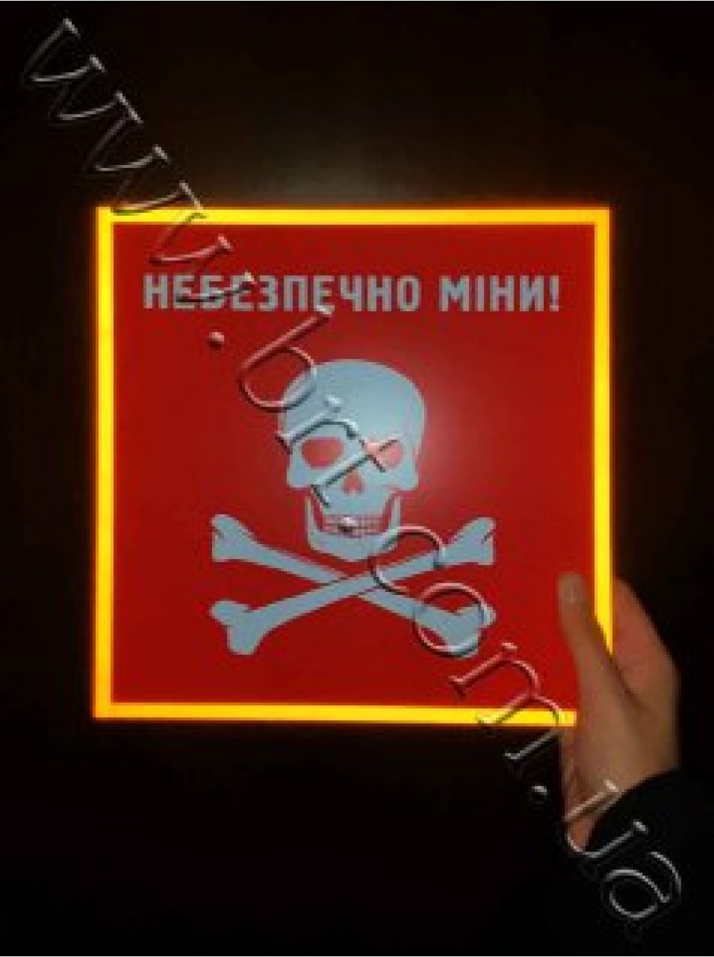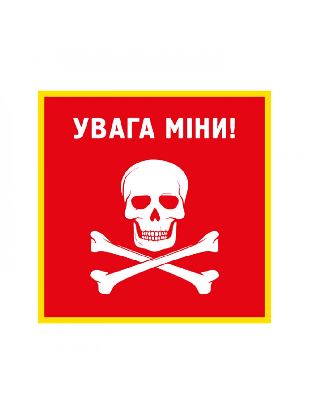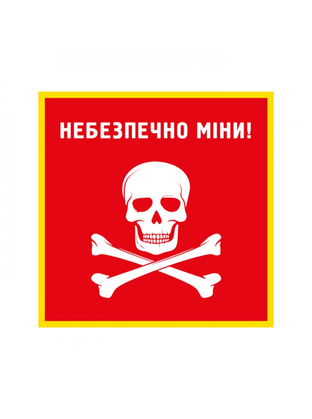 Попереджувальний знак - табличка "Небезпечно міни", "Увага міни", "Стоп міни" виготовлена у відповідності до правил позначення небезпек, пов'язаних з мінами та вибухонебезпечними предметами - наслідками війни. Червоний фон, білий символ небезпеки (череп зі схрещеними кістками), світловідбивна жовта смуга по контуру. Купити в Україні у виробника "Бюро рекламних технологій". Табличка "Небезпечно міни" - відео.