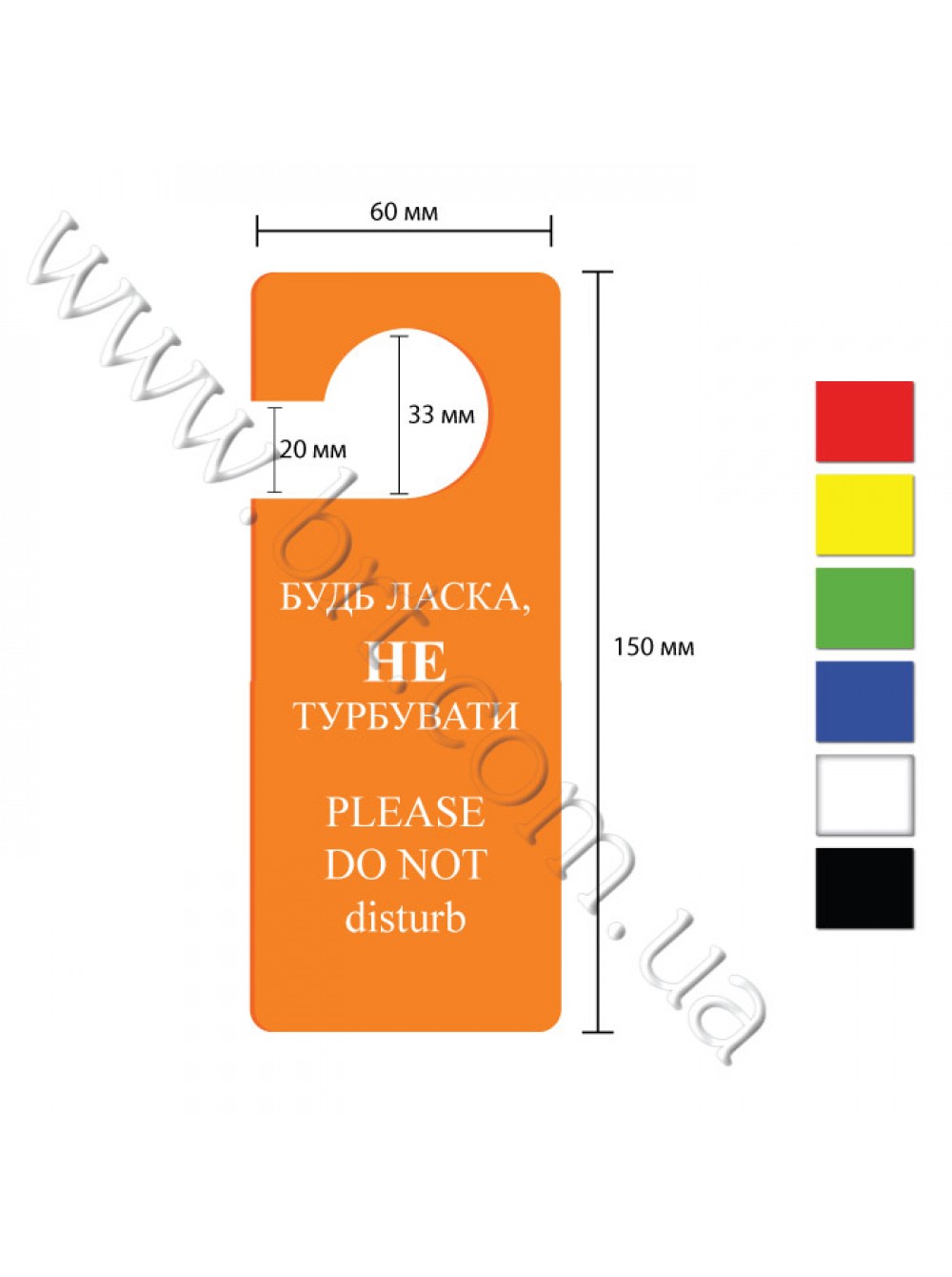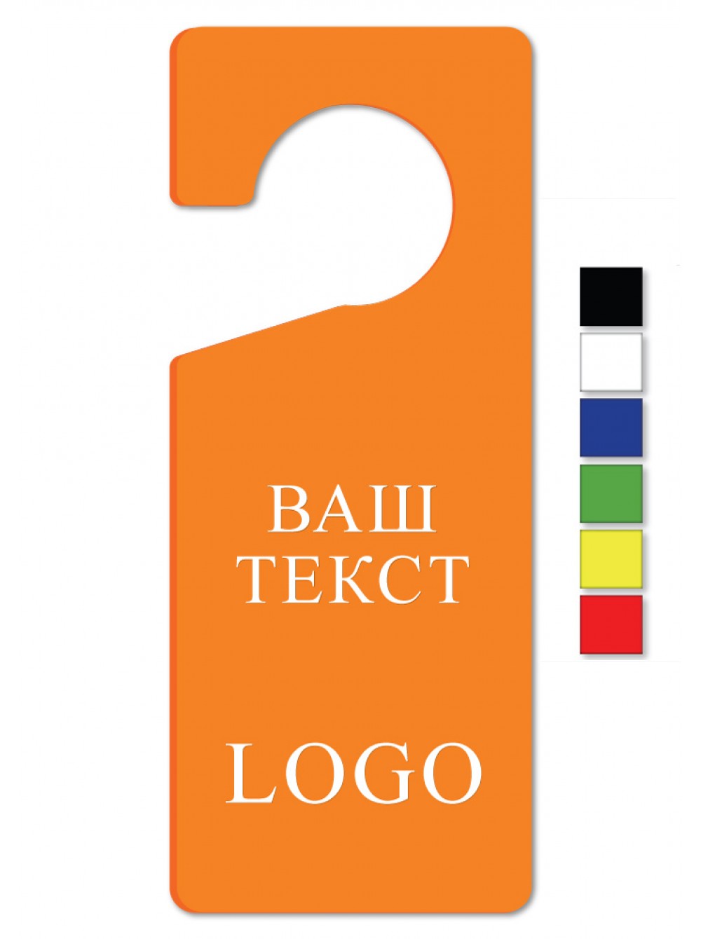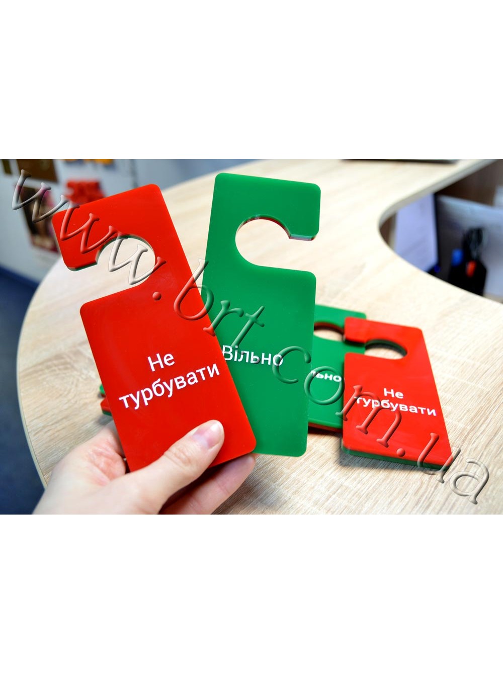 Таблички пластикові з акрилу на ручку дверей (хенгери) будь-якої форми та розміру на замовлення. Ми – Бюро рекламних технологій – виготовляємо хенгери зі стандартними написами українською та англійською мовами: Не турбувати, Прибрати у номері, Прибирання. Якщо ви хочете персоналізувати підвіску на ручку (додати логотип, текст, змінити розмір, форму).