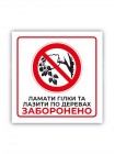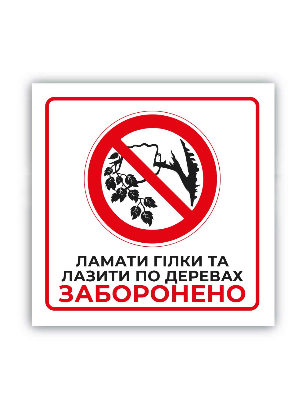 Табличка "Ламати гілки та лазити по деревах заборонено" – наочний спосіб привернути увагу до правил поведінки в парках, скверах та інших зелених зонах. Яскравий червоно-чорний дизайн з ілюстрацією дерева, гілки та руки, що її ламає, а також червона лінія, яка перекреслює, роблять знак максимально зрозумілим і помітним. Табличка виготовлена з міцних матеріалів, стійких до погодних умов, тому підходить для встановлення на вулиці.