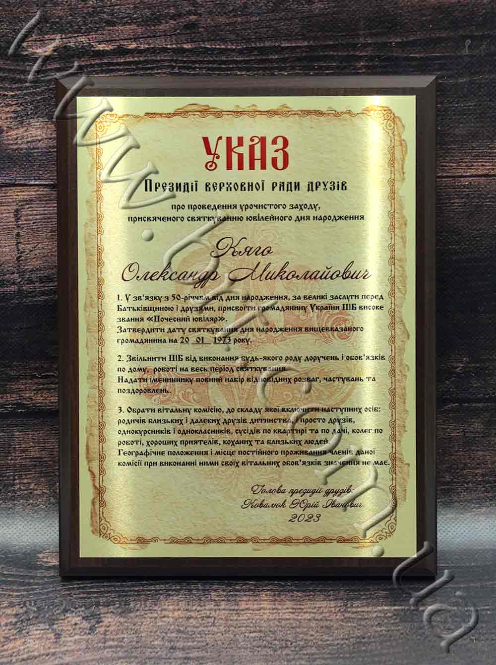 Указ від Верховної Ради друзів з іменем – жартівлива постанова, яку урочисто вручають на День народження чи ювілей колегам, знайомим, родичам, коханим. Купити в Україні дотепний документ пропонує наша компанія «Бюро рекламних технологій». Указ друкується не на звичайному папері, а на металевій пластині, яка закріплюється на дерев’яній основі.